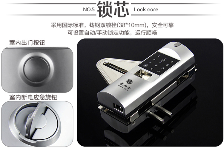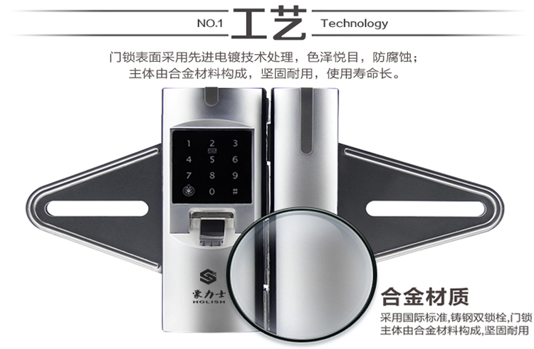 豪力士玻璃門(mén)禁指紋鎖鋅合金材質、時尚銀D2120F